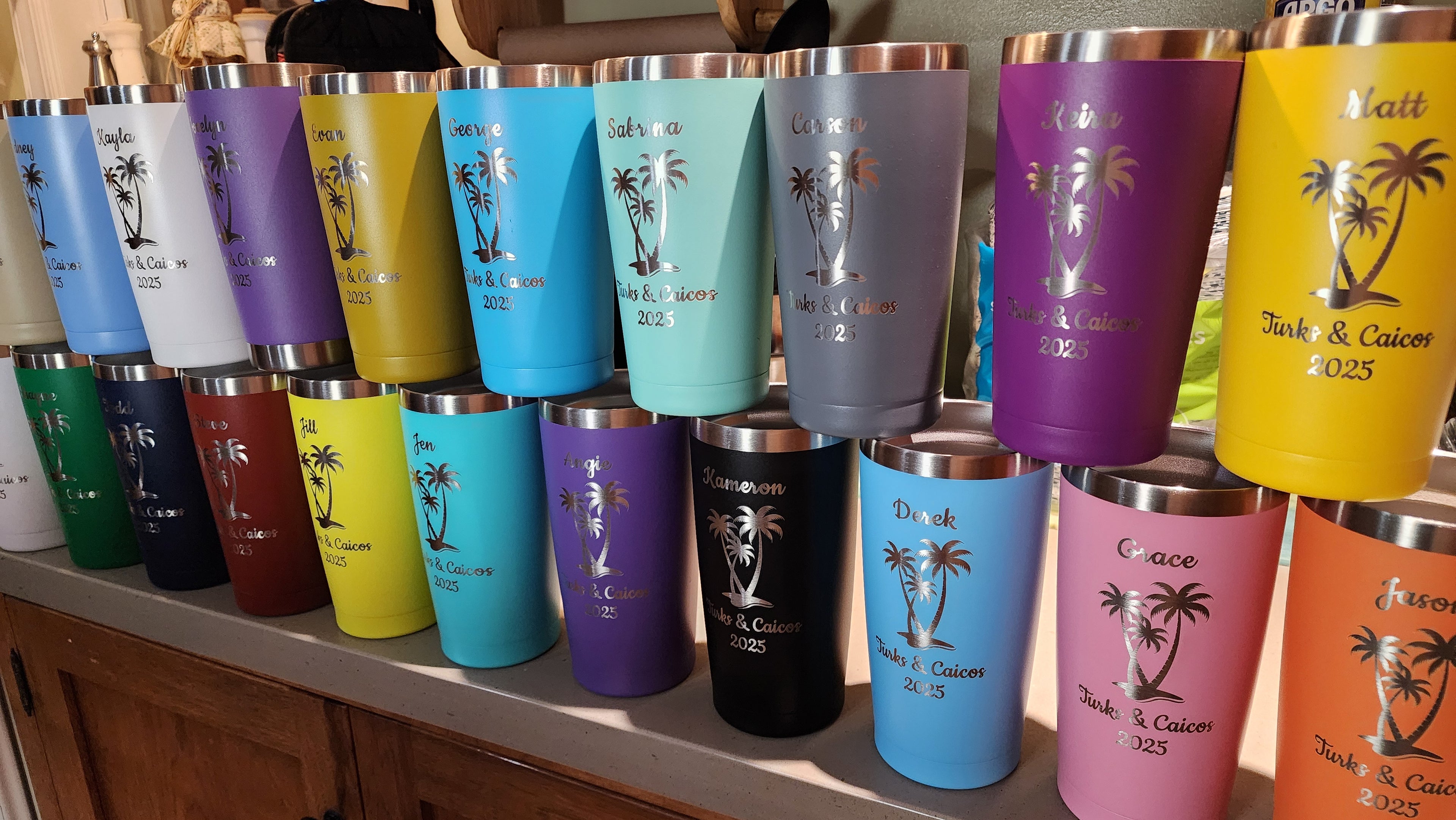 Many insulated tumblers, flasks, and water bottles have a paint coating which can be laser engraved away. This will expose the stainless steel underneath giving the product a metallic effect. The treatment is permanent will not affect the integrity of the item.