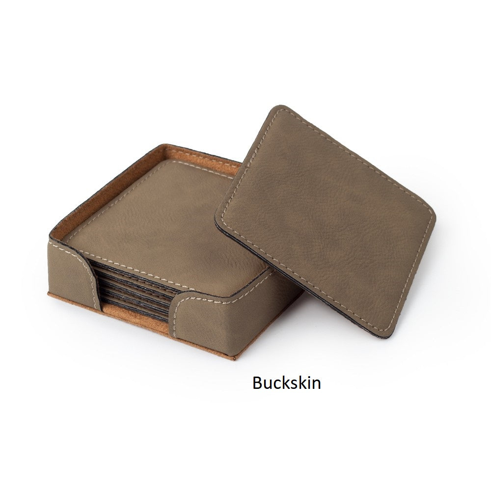 Individuell graviertes Set aus 6 personalisierten Kunstlederuntersetzern, wunderschön graviert mit einem Standarddesign oder Ihrem individuellen* Text oder Design. Die 4 x 4 Zoll großen Kunstlederuntersetzer haben eine Polsterung an der Unterseite, um Möbel zu schützen . Perfekt als Einweihungsgeschenk, Geschenk für frisch Vermählte, Hochzeitsgeschenk und Geschenk für jeden anderen Anlass.