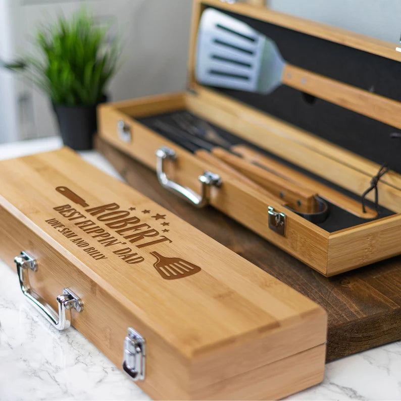 Grillen Sie Ihr Lieblingsessen mit Stil mit diesem personalisierten Grillbesteck-Set! Mit der individuellen Gravur sind diese Besteckteile die perfekte Ergänzung für jede Terrasse im Hinterhof – und ein tolles Geschenk für den Grillmeister in Ihrem Leben! Mit diesem Set wird Ihr nächstes Grillfest garantiert „personalisiert“!