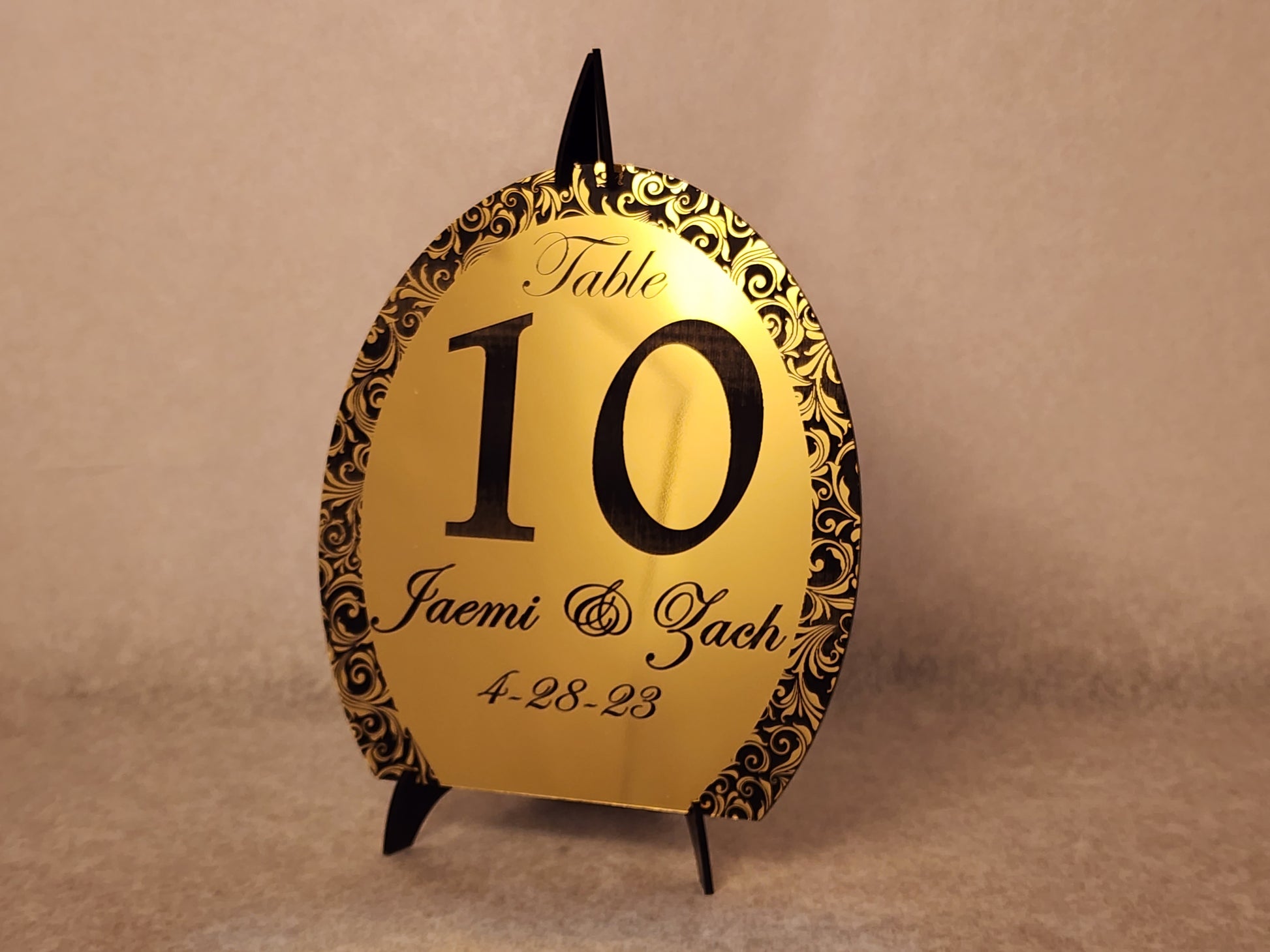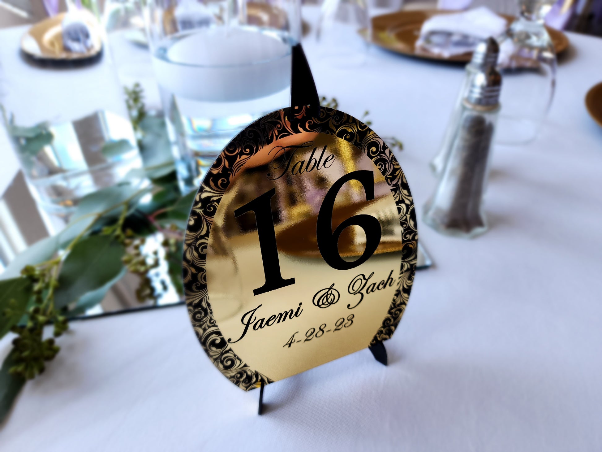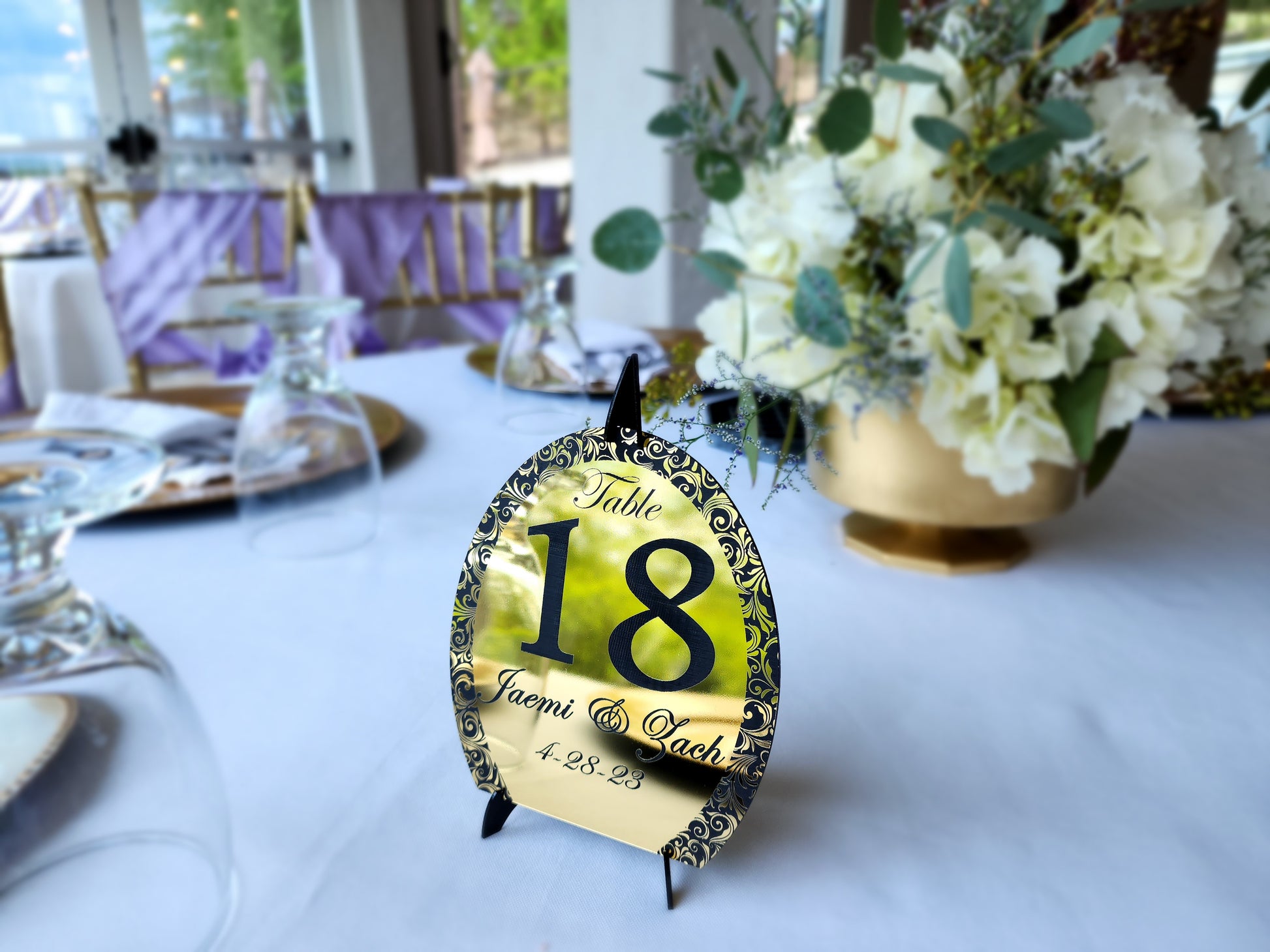 Diese wunderschönen Tischnummernschilder aus Acryl in Bogenform sind der perfekte Akzent für Ihren besonderen Tag! Erhältlich in verspiegeltem Gold oder Silber mit Ständer. Jede Tischnummer ist mit Namen und Veranstaltungsdatum graviert und verleiht Ihrer Tischdekoration eine atemberaubende und elegante Note!