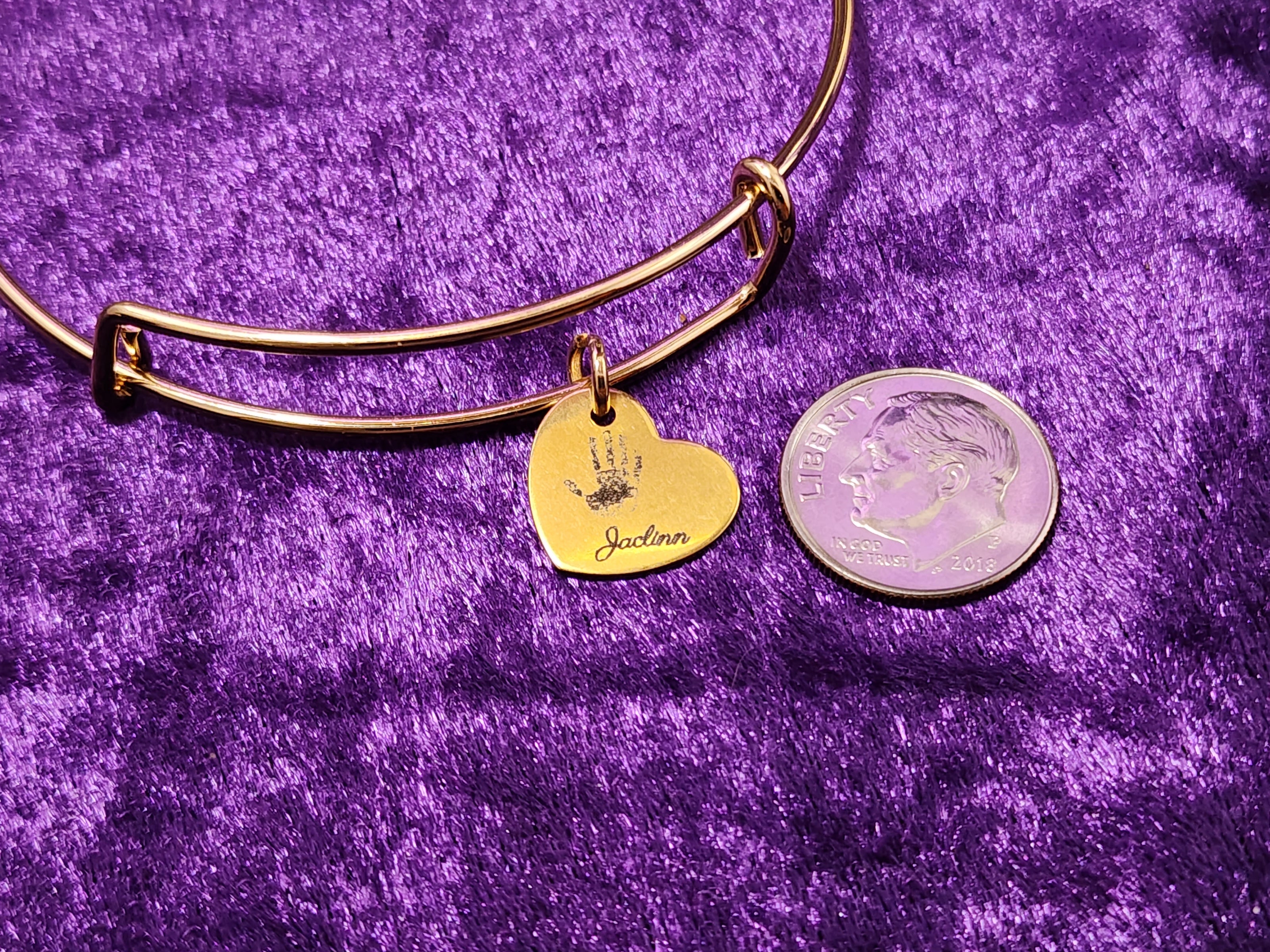 Handprint, Footprint, or Pawprint Charm Bangle BraceletEmbrace the adorable chaos of life with our Handprint, Footprint, or Pawprint Charm Bangle Bracelet. A charming accessory that captures memories and adds a touch of whimsy.