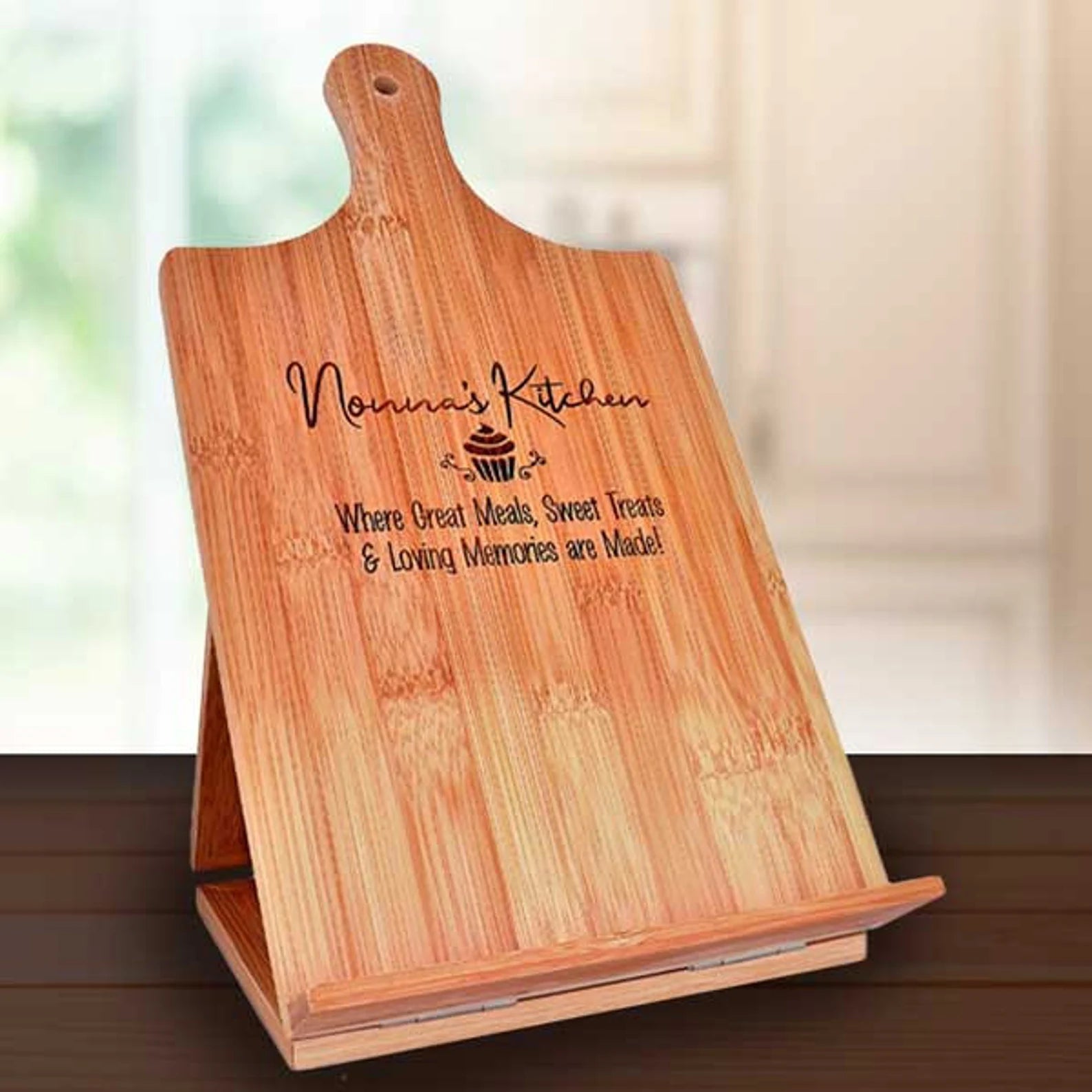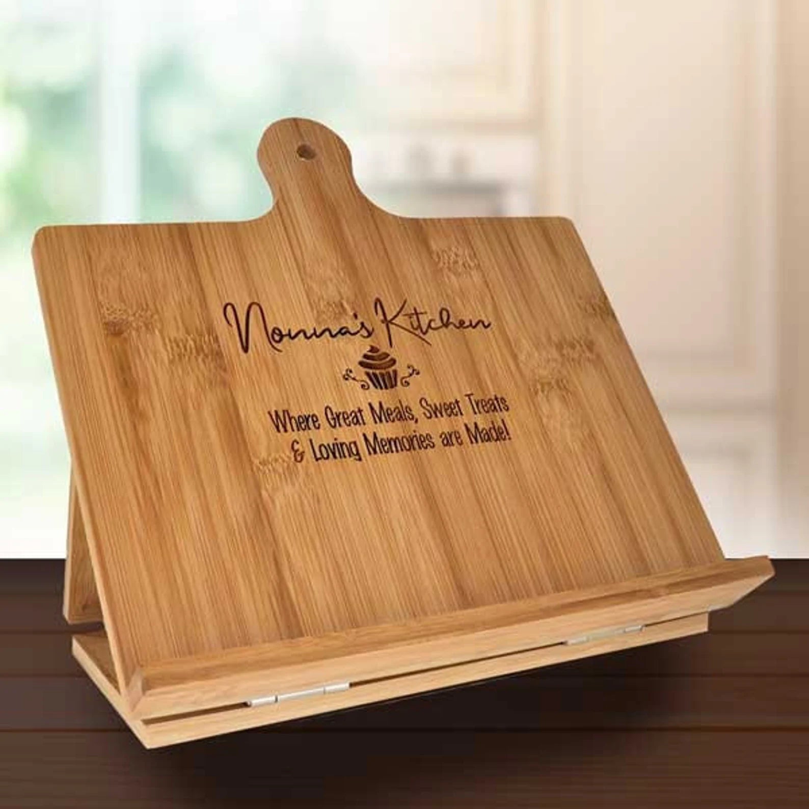 Give your culinary skills a stylish upgrade with our Custom Bamboo Standing Chef's Easel. Made from sustainable bamboo, this quirky easel adds a touch of fun to your kitchen while keeping your recipes organized and at eye level. Say goodbye to messy countertops and hello to a more efficient and playful cooking experience! (Recipes not included!)